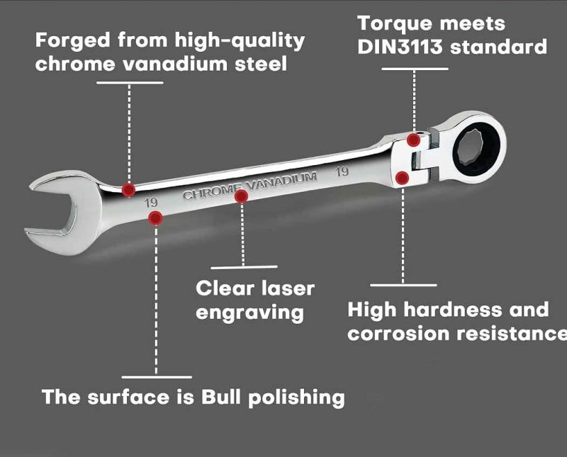 La chiave a cricchetto con testa flessibile industriale placcata è realizzata in acciaio Cr-V forgiato con buona durezza, più durevole, più forte e resistente alla corrosione.